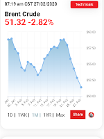 Това е графиката за цената на референтния за Уралс марка Брент. Днес тя падна под 51,46 долара за барел, като загуби повече от 2,5 процента от стойността си. Тенденцията е да продължи да пада. За тези, които ще скочат, че цените на бензиноколонките не могат да отразят цените на пазарът на суров нефт, отново погледнете, че тези тенденции и този срив не е от вчера.