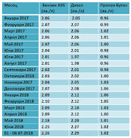 А сега да сравним цените на основния тип бензин и на дизела между 2017 година, което е видно в тази таблица – обърнете внимание на месеците юни и юли – виждате цени около 2 лева за литър.