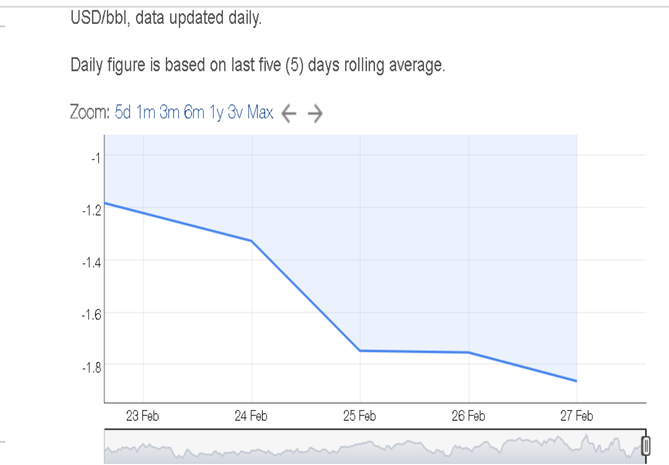 А сега вижте, каква е дневната разлика – и дисконта с който се търгува референтния за рафинерията в Бургас марка Уралс, – дисконтът е повече от 1,8 долара под цената на Брент, тоест е под 50 долара.