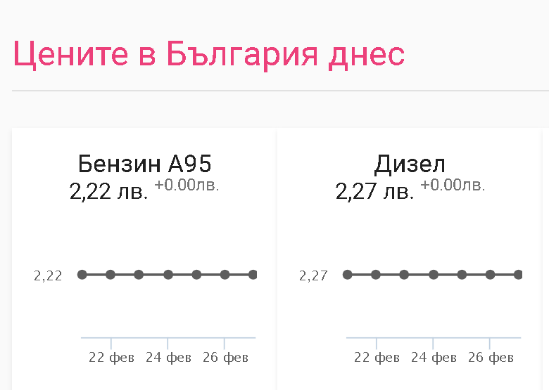 А сега вижте какви са данните за цените на бензиностанциите днес в България – средните равнище са 2,27 лева на литър за дизел и 2,22 лева за бензин. Разликата е внушителна – съответно 27 и 22 стотинки на литър.